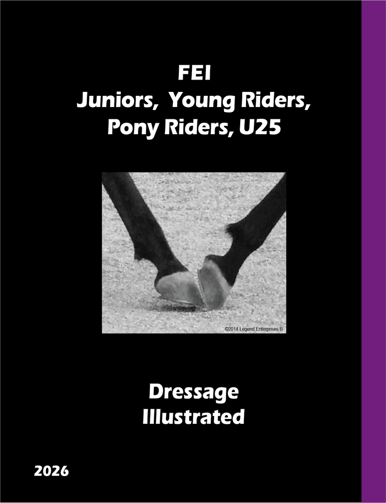 Text and graphic diagrams of the 2026 FEI Juniors Preliminary, Team, Individual, Young Riders Preliminary, Team, Individual, Pony Riders Preliminary, Team, Individual, FEI Grand Prix 16-25, Freestyle Juniors, Freestyle Young Riders, Freestyle Pony Riders  All coefficient movements (double points) are shaded for easy identification.  Includes the directive ideas for each movement. Size 8.5x11 inches 3-Ring-Binder or 3-hole punched.  In stock, available for purchase